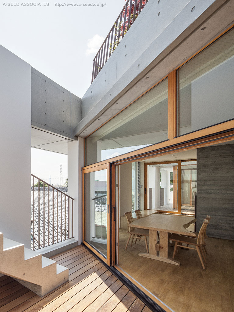 鉄筋コンクリート造3階建(ルーフガーデン有) 建設地:東京都葛飾区 敷地面積:289.6㎡(89.4坪) 延床面積:373.4㎡(112.9坪) 建築面積:171.7㎡ (53.0坪) 構造設計:サダリ構造設計室 施工:株式会社 佐藤秀 撮影:平井写真事務所(平井広行)