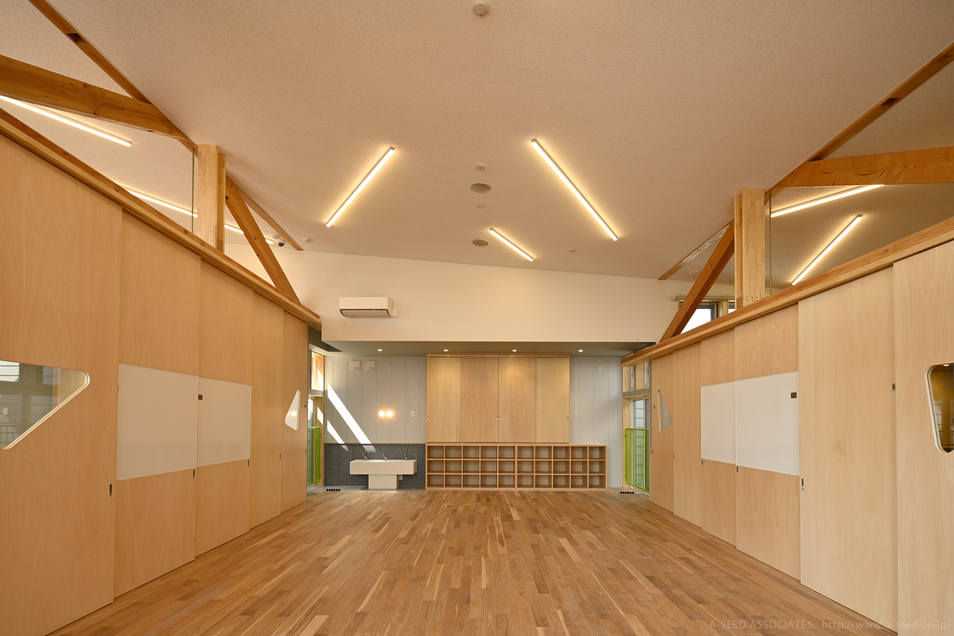 主要用途:保育園 建設地:埼玉県川口市 構造・規模:木造地下1階 地上2階 延床面積:832.8㎡ 建築面積:471.05㎡ 竣工:2020年3月 設計監理:並木秀浩、森本朝子 株式会社ア・シード建築設計 構造設計:江尻憲泰、藤田実 有限会社江尻建築構造設計事務所 施工:中村建設株式会社 撮影:守屋欣史 Nacasa & Partners Inc.